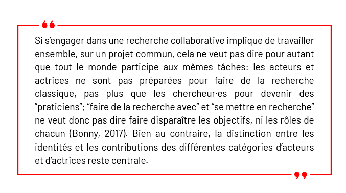 Cette citation est extraite de l'ouvrage dédié à cette recherche (« Chapitre 14. S’engager dans une recherche collaborative : un bilan contrasté ». Le pouvoir d’agir dans les centres sociaux, édité par Héloïse Nez et al., Presses universitaires du Septentrion, 2023). Pour découvrir la fabrique de cette recherche et l'analyse portée sur les modalités de collaboration, consultez ce chapitre en accès libre: