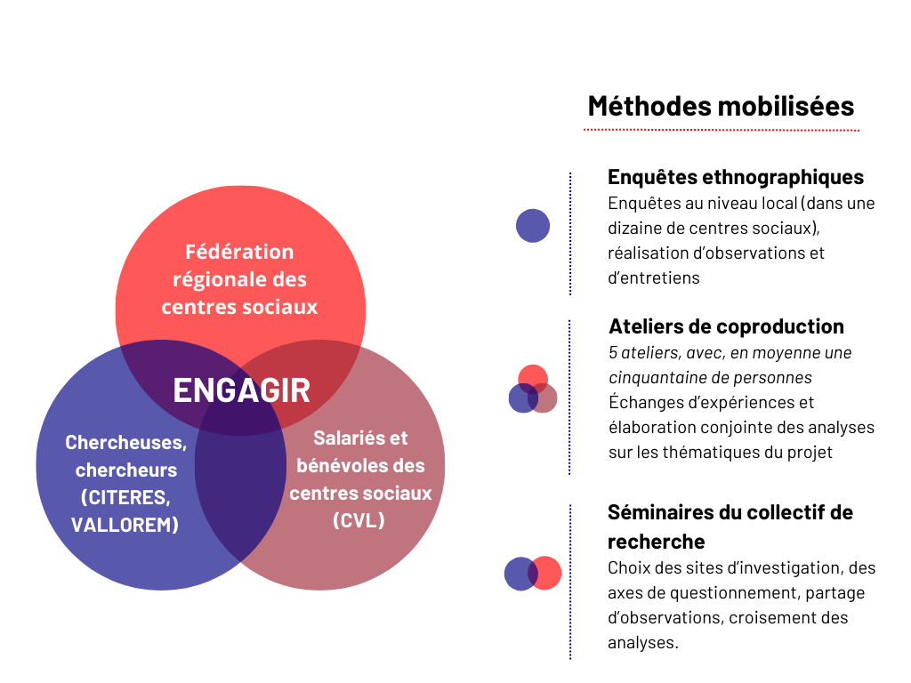 Engagir a réuni des membres de la Fédération des centres sociaux Centre-Val de Loire, des salarié·es et bénévoles de centres sociaux de la région et une équipe d’une dizaine de chercheuses autour d’intérêts communs. Il s’agissait notamment de développer, dans une double visée, scientifique et politique, une réflexion commune sur la notion de pouvoir d’agir, ses usages dans les centres sociaux, les actions menées en référence à cette visée et les discussions auxquelles elle pouvait donner lieu."Une collaboration entre les faiseux et les chercheurs, c’est primordial pour avancer, pour affuter, ajuster notre projet pour une société meilleure ».