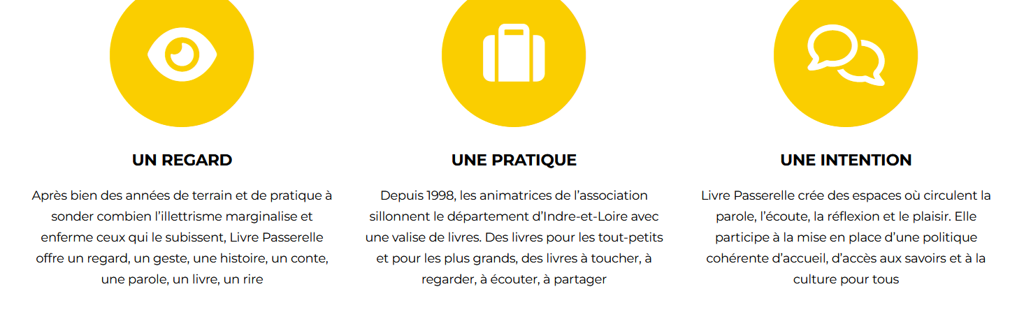 Depuis son site internet, l'association Livre Passerelle présente ses axes fondateurs: