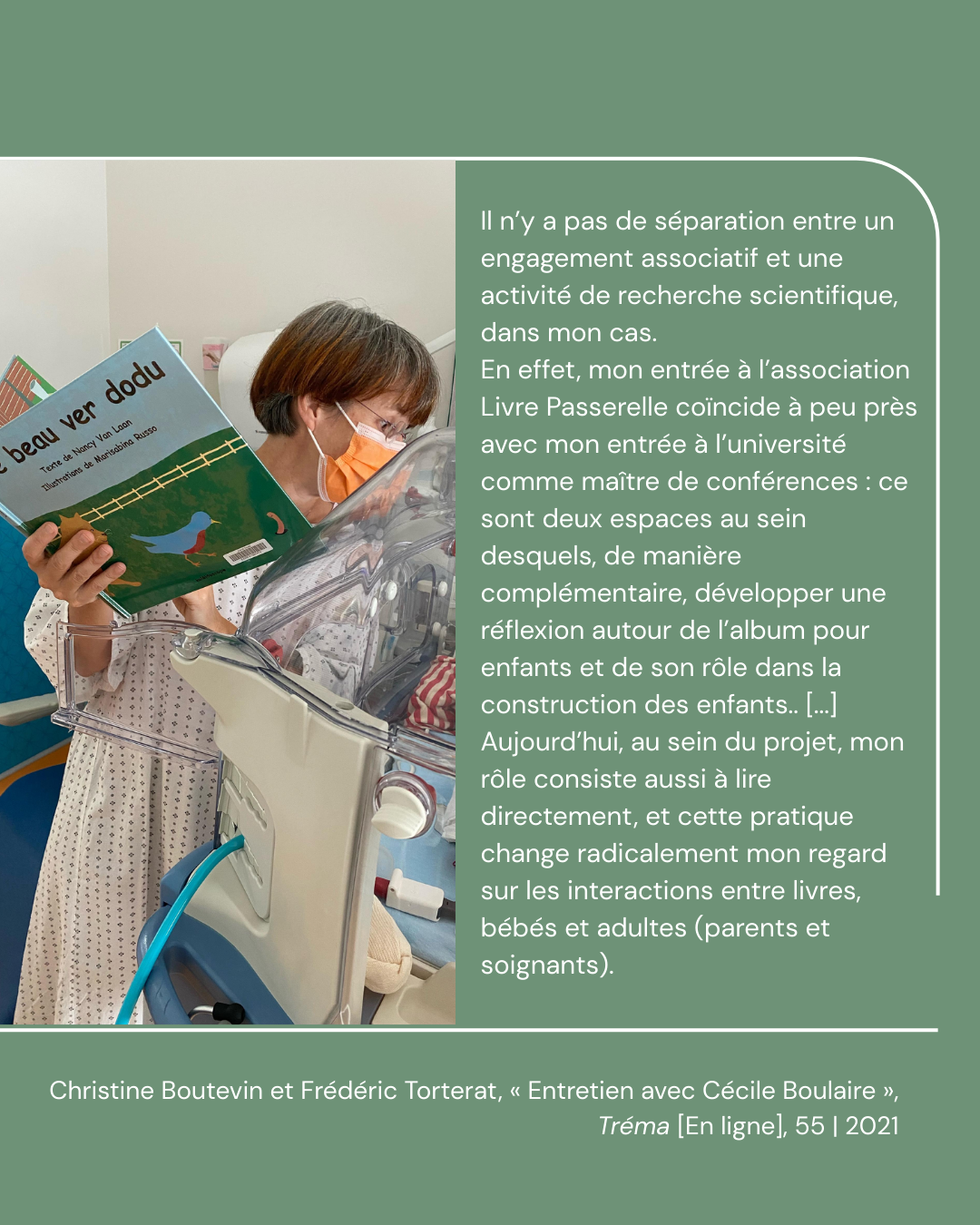 Cécile Boulaire, elle-même membre du conseil d'administration de l'association Livre Passerelle et lectrice auprès des bébés prématurés, revient ainsi sur son double engagement: